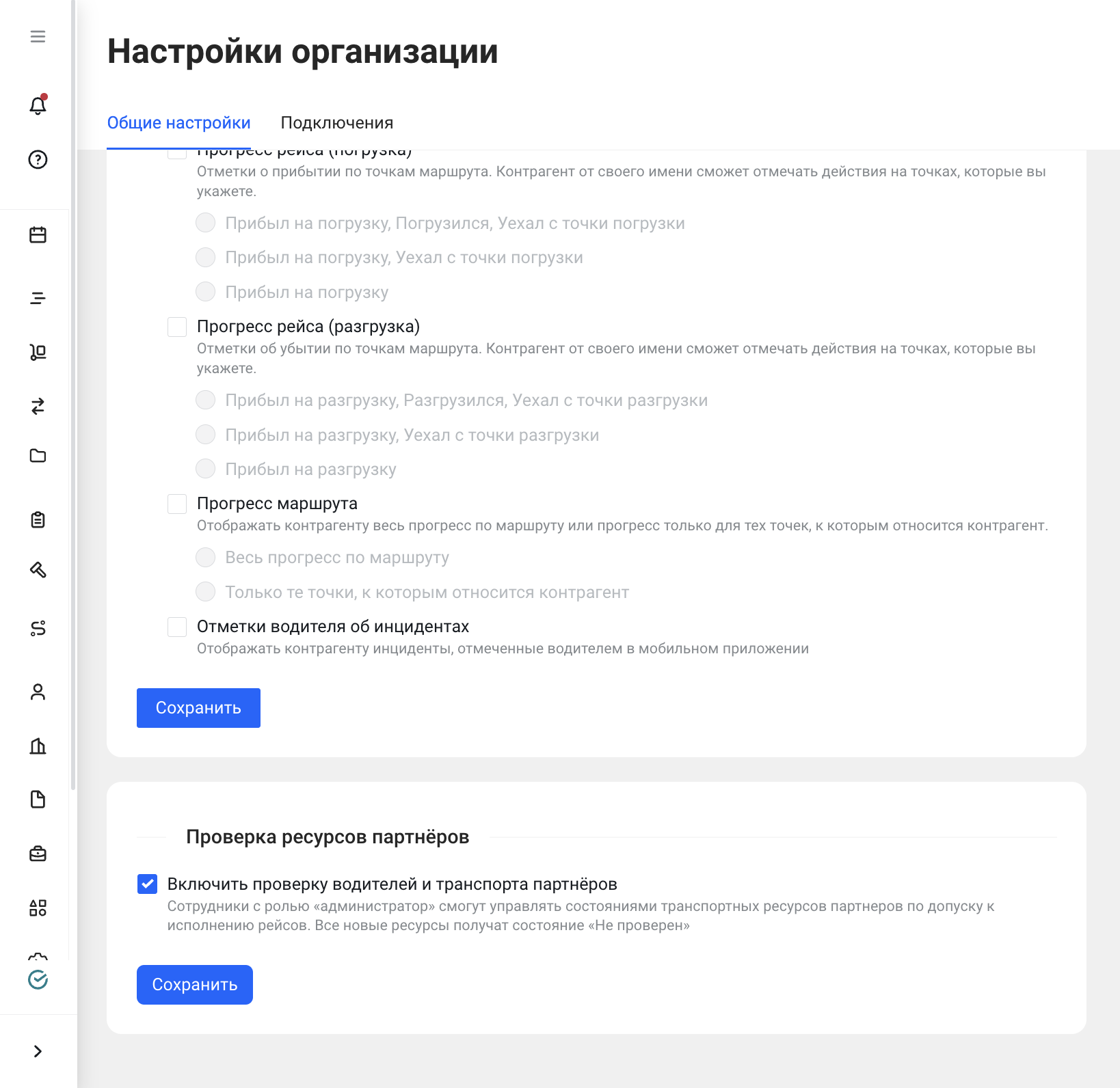 Если настройка включена, все транспортные средства получают статус "Не проверен", что ограничивает возможность перевозчика переводить рейсы по статусной ветке. Если настройка в организации отключена, статус проверки перестает иметь значение, включая "Стоп-лист". В этом случае перевозчики могут назначать любые ресурсы на любые рейсы без ограничений, а состояние проверки сохраняется, но не влияет на распределение ресурсов.