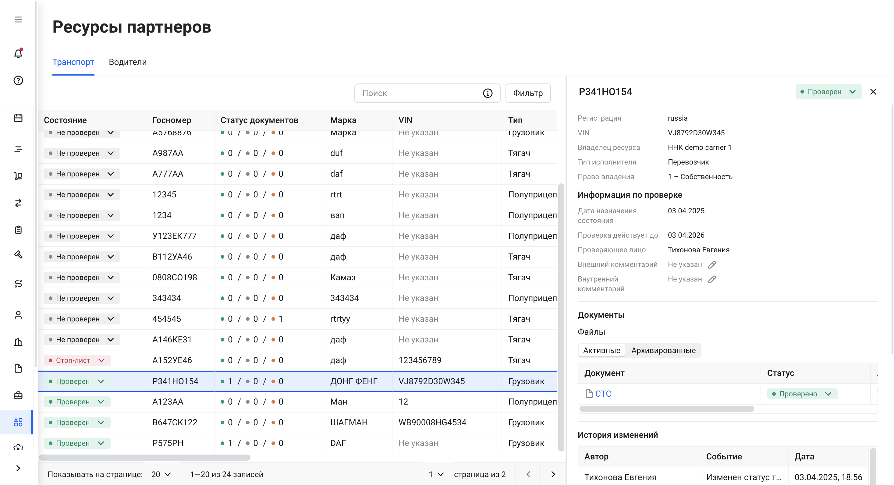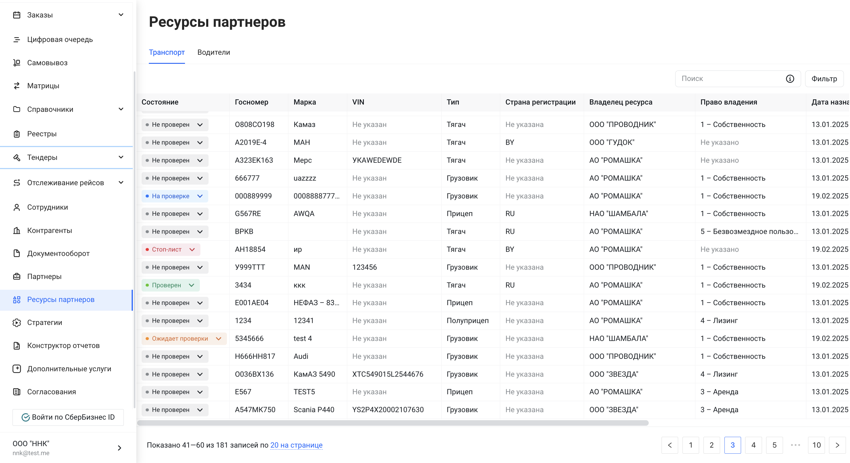 - Когда перевозчик добавляет транспортный ресурс в систему, ему автоматически присваивается статус "Не проверен".