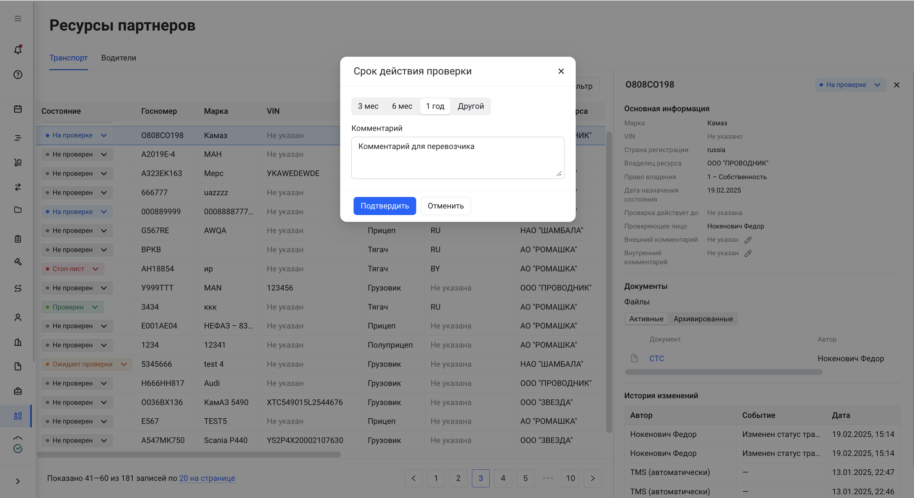 Функционал проверки транспортных ресурсов позволяет грузовладельцу вручную проверять данные по водителям, тягачам, полуприцепам и прицепам перед их назначением на рейсы. Проверка включает просмотр данных ресурса, загруженных документов, логов предыдущих проверок и возможность добавления комментариев.