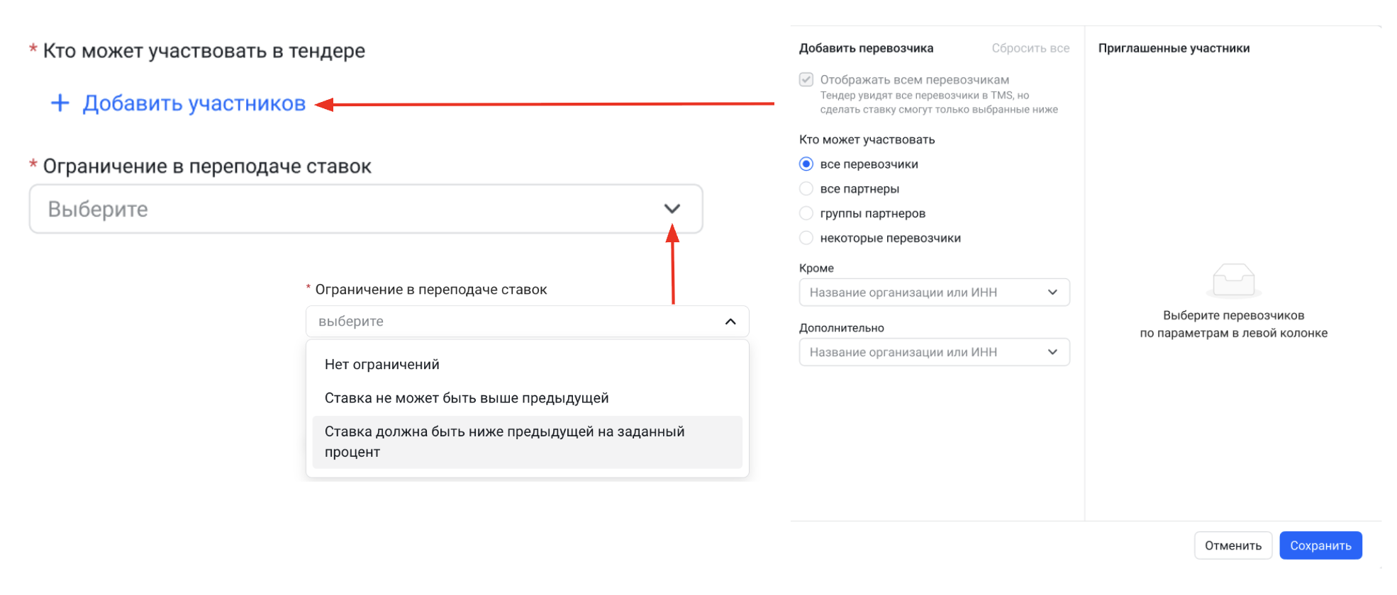 Некоторые перевозчики — только избранные перевозчики из числа ваших партнеров будут допущены до этапа