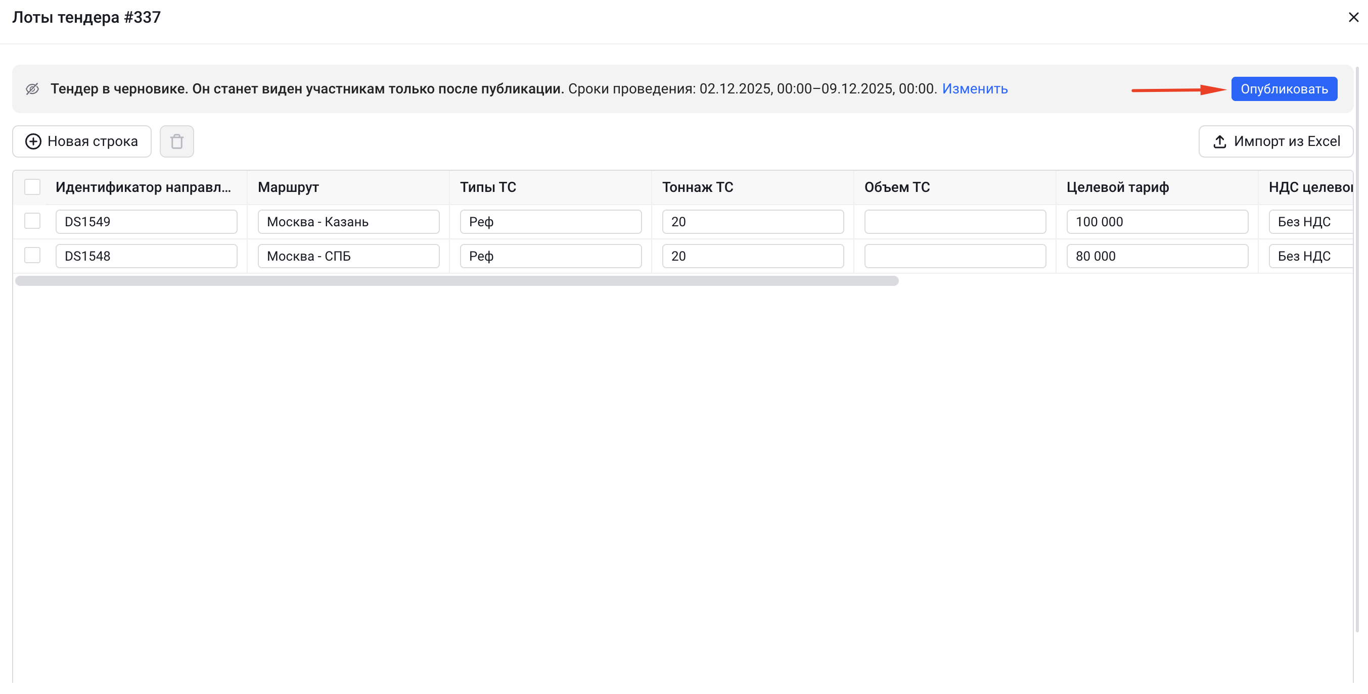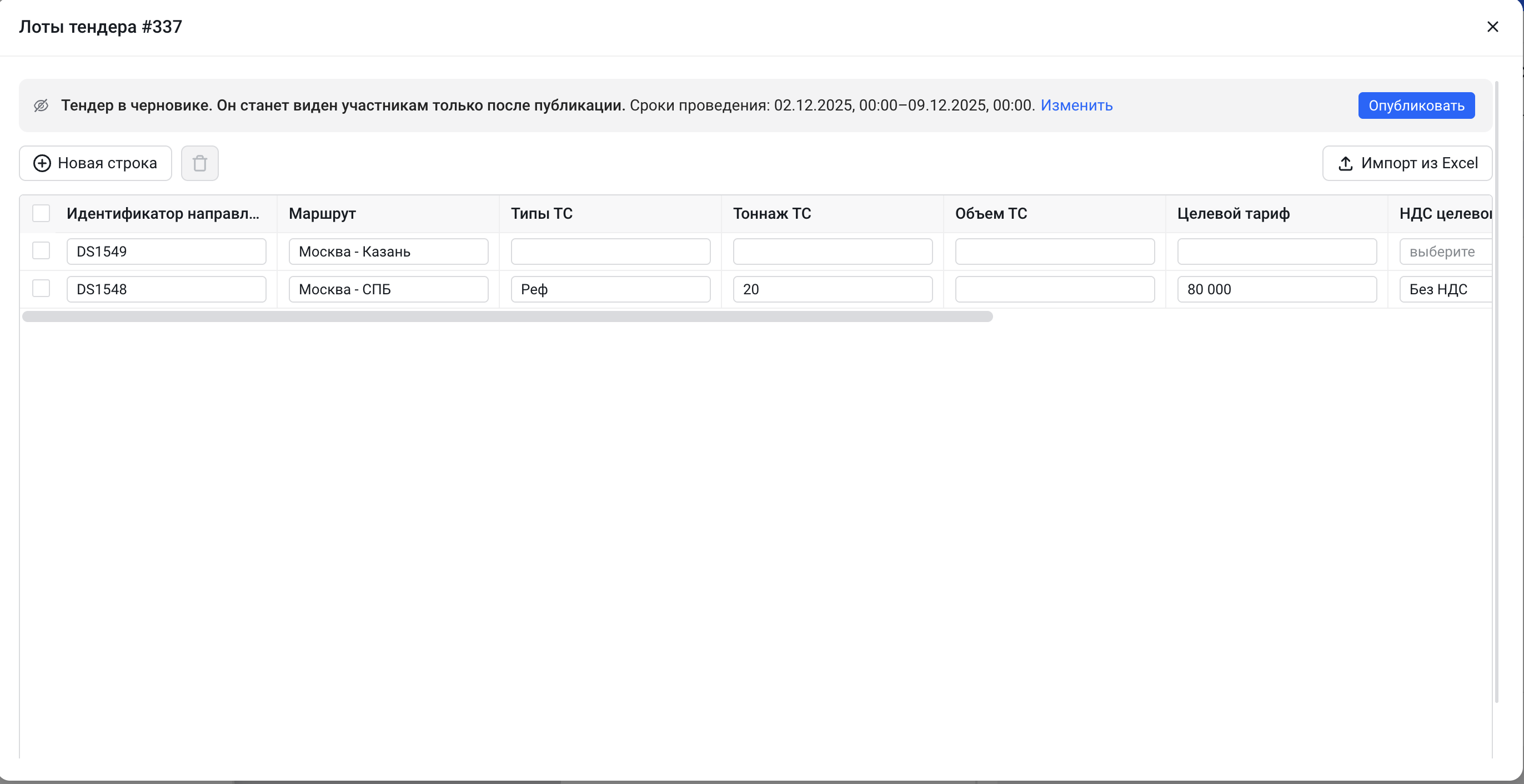 - Тендер для размещения находится во вкладке "Все" и "Черновик" в статусе "Черновик"