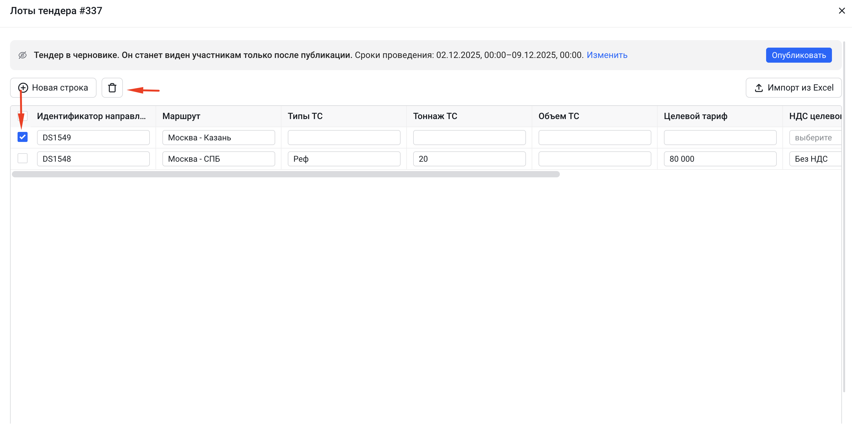Для удаления строки поставьте галочку в чекбоксе и нажмите на кнопку с изображением корзины