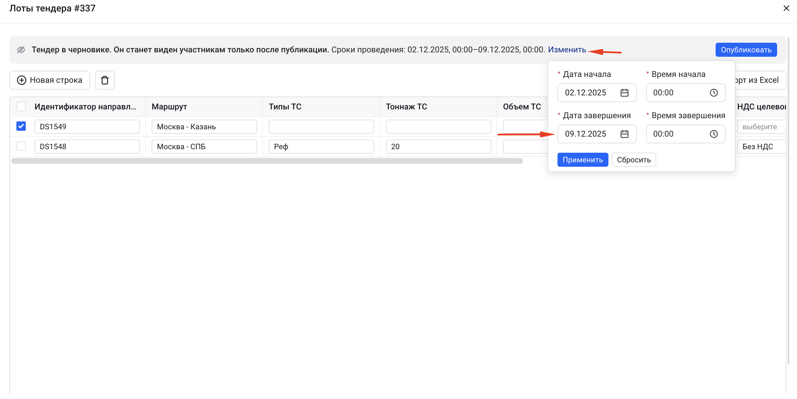 - Для изменения дат и времени проведения тендера нажмите на кнопку "Изменить"