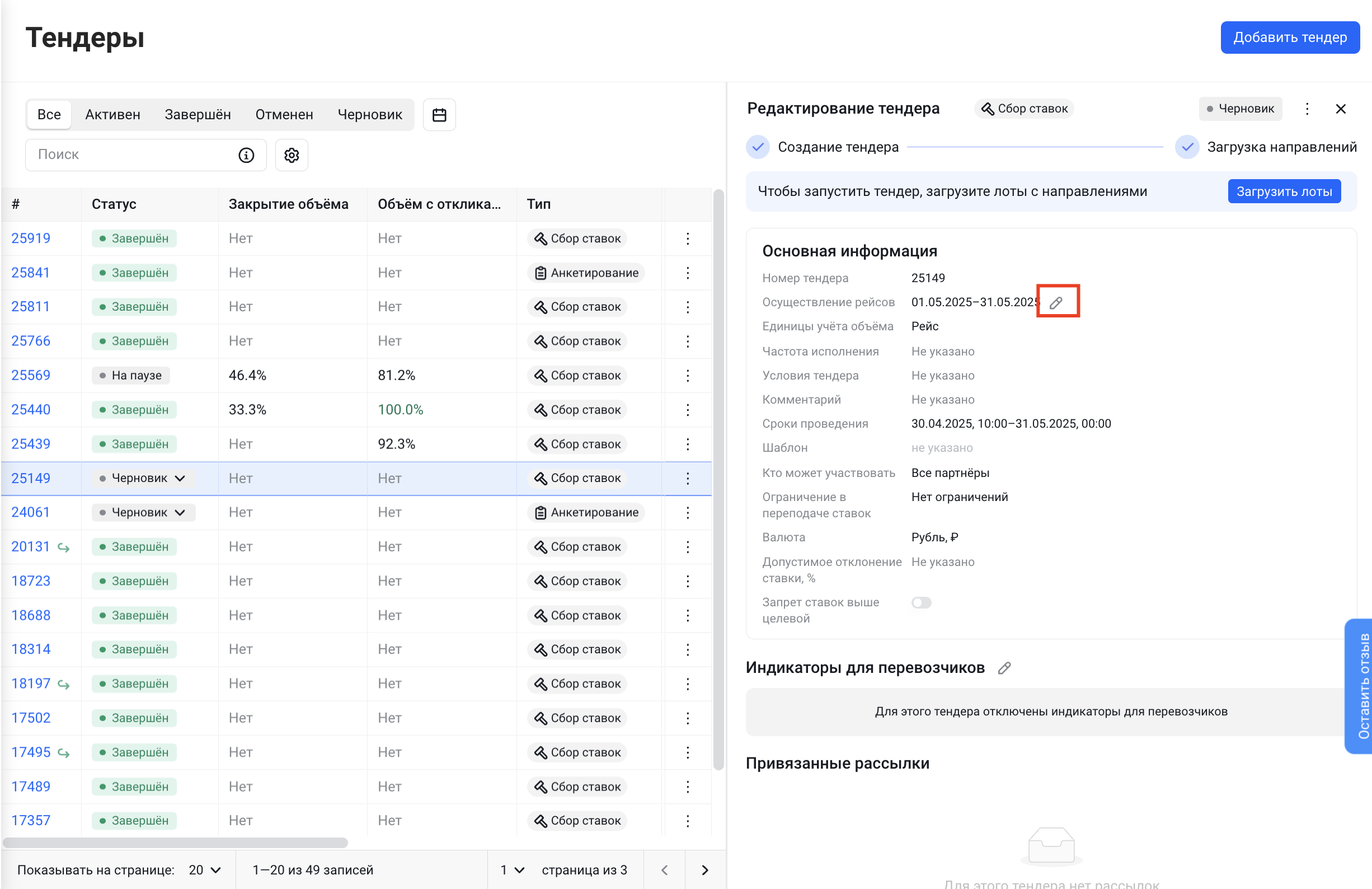 После входа в режим редактирования система приостановит текущий этап тендера, а всем перевозчикам будет отправлено уведомление.