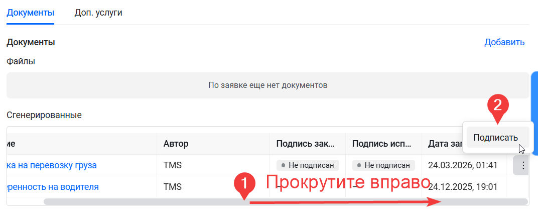 Статусы подписания отображаются внутри Заявки на вкладке "Документы", в блоке «Сгенерированные». Там две колонки: Подпись заказчика и Подпись исполнителя.