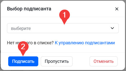 В открывшемся окне выберите нужного подписанта из выпадающего списка (если он не подставился автоматически) и нажмите кнопку "Подписать". Статус документа мгновенно изменится.