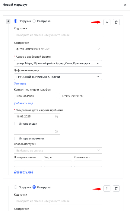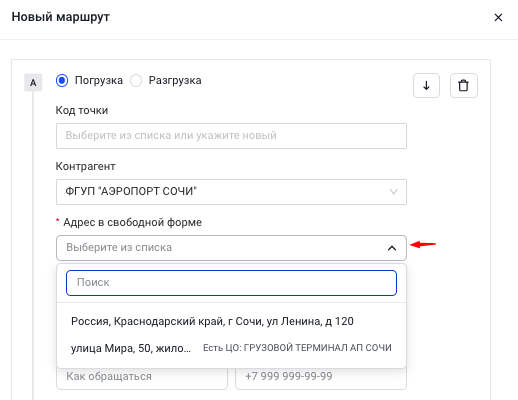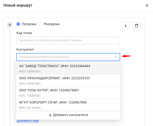 Все данные о контрагентах подтягиваются из одноименного справочника. Если список пока пуст или не хватает нужной компании, новые данные можно добавить по ходу заполнения маршрута. Достаточно нажать на кнопку + Добавить контрагента
