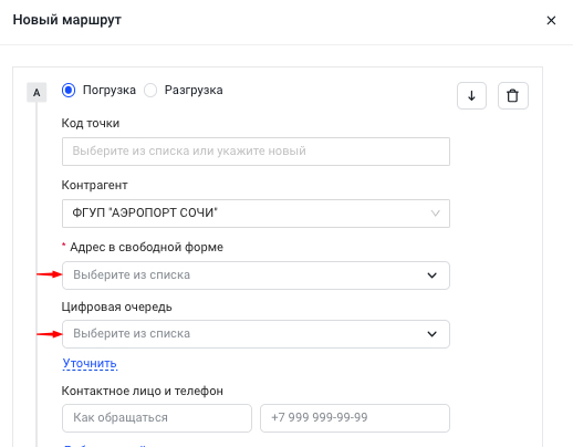 Либо в виде вашего персонального обозначения, например, склад №5. В этом случае необходимо привязать к этому обозначению реальную точку на карте. Для этого нажмите на кнопку Уточнить, заполните текстовую информацию о расположении точки: Страна, Область, Населенный пункт и поставьте правильную отметку на карте. Система создаст и запомнит локальный адрес с названием “Склад №5”При выборе контрагента и адреса, к которым привязана цифровая очередь, она автоматически подставляется в поле «Цифровая очередь». Если цифровая очередь не привязана к выбранным контрагенту и адресу, пользователь может вручную выбрать её из списка доступных цифровых очередей.