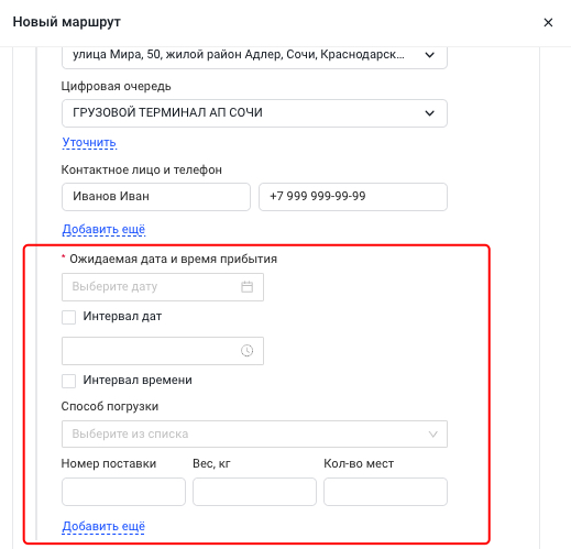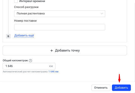 - Если в одной машине поедут разные заказы, дабавьте еще одну поставку, нажав на кнопку Добавить еще