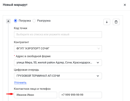 - Укажите контакты — информация о сотруднике, с которым может связаться водитель для решения всех вопросов по прибытии