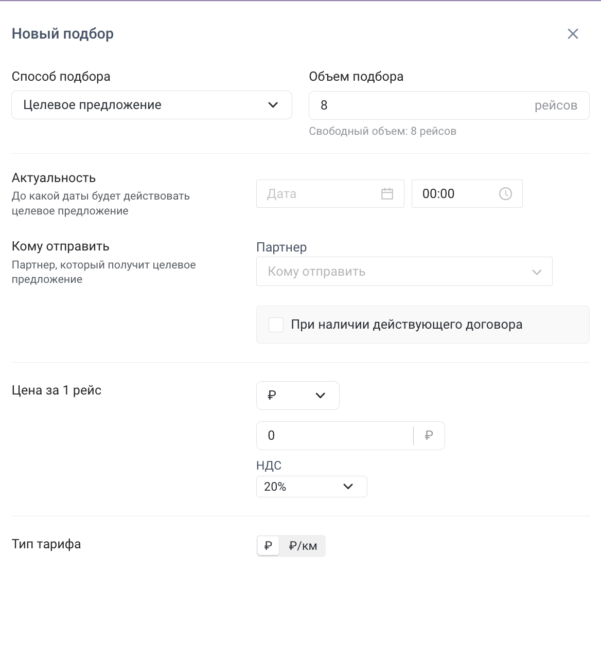 | Целевое предложение | Возможность отправить заказ конкретному перевозчику по индивидуальной цене. Цену можно выставить вручную или выбрать подсказку из прайс-листа. Также необходимо указать актуальность целевого предложения — время, до которого перевозчик должен подтвердить предложение. |