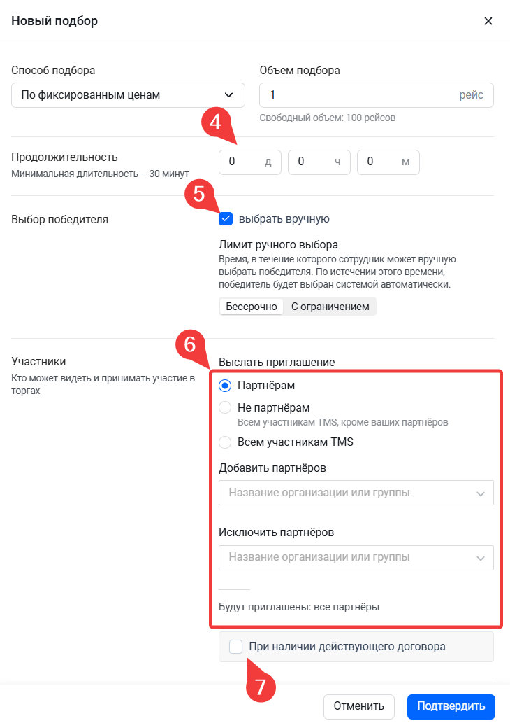 • если включен ручной выбор победителя, откройте подбор и выберите победителя среди перевозчиков, которые приняли предложение