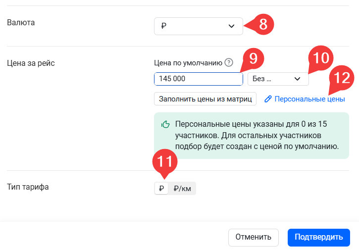 Заполните все персональные цены, которое вы хотите предложить перевозчикам. В подсказке будет указано, скольким перевозчикам вы предлагаете персональные цены.
