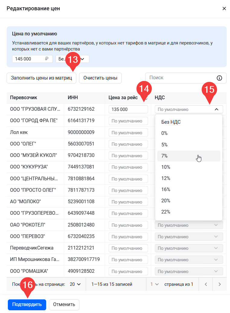 14. Либо указать свои цены вручную для отдельных перевозчиков.