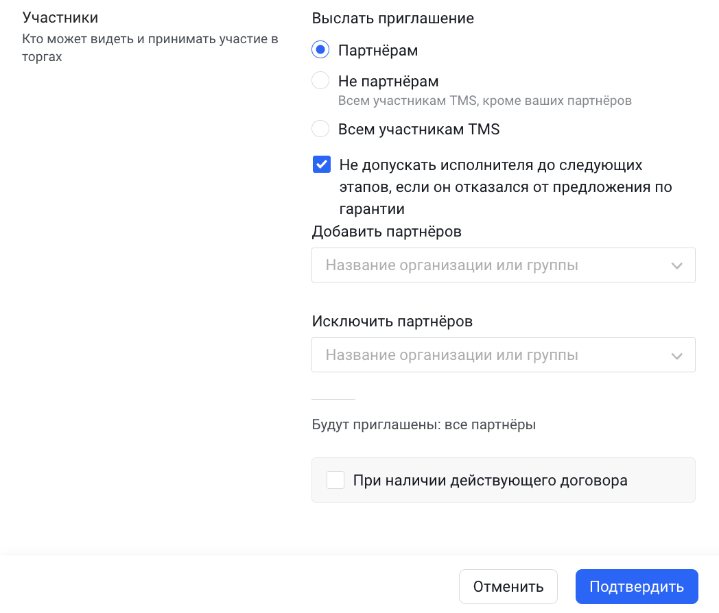 • Установите отметку в чек-боксе "При наличии действующего договора", если хотите допускать к торгам только исполнителей с действующим договором (договоры добавляются в разделе Партнеры)