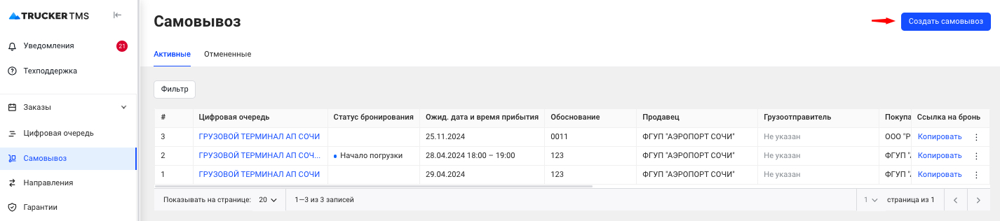- Справа вверху нажмите на синюю кнопку Создать самовывоз
