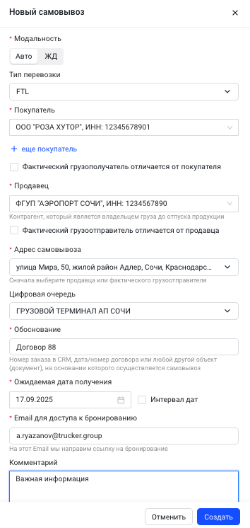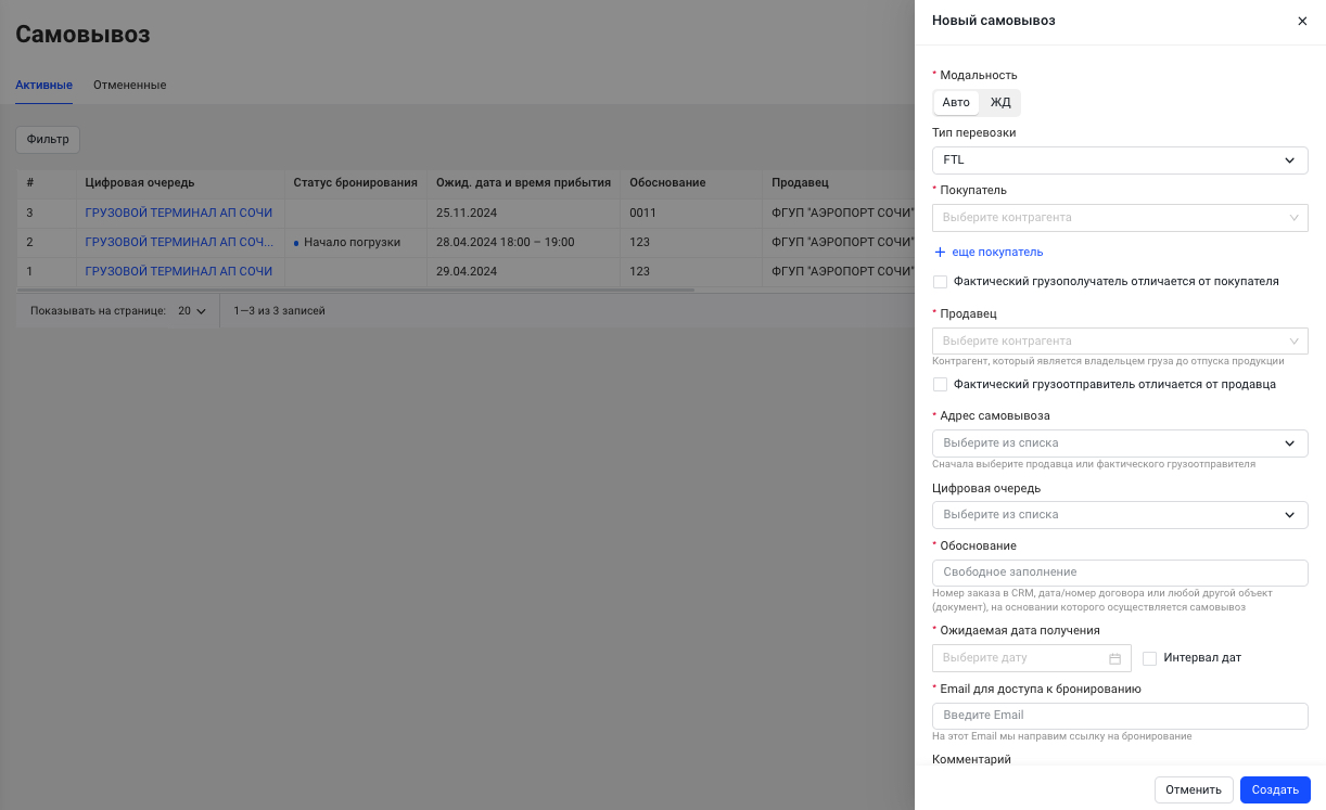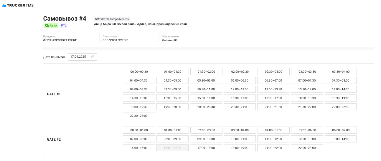 - Пустое поле — перевозчик еще не выбрал время и не назначил транспортные ресурсы