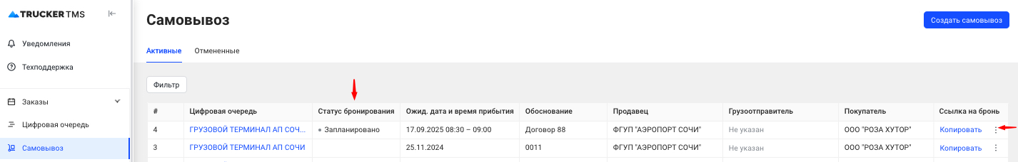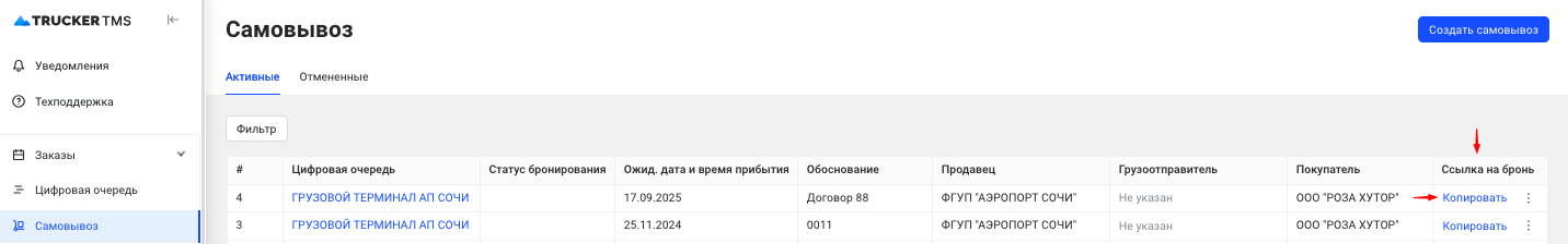 В столбце «Ссылка на бронь» можно скопировать ссылку, нажав на слово «Копировать», и отправить её перевозчику.