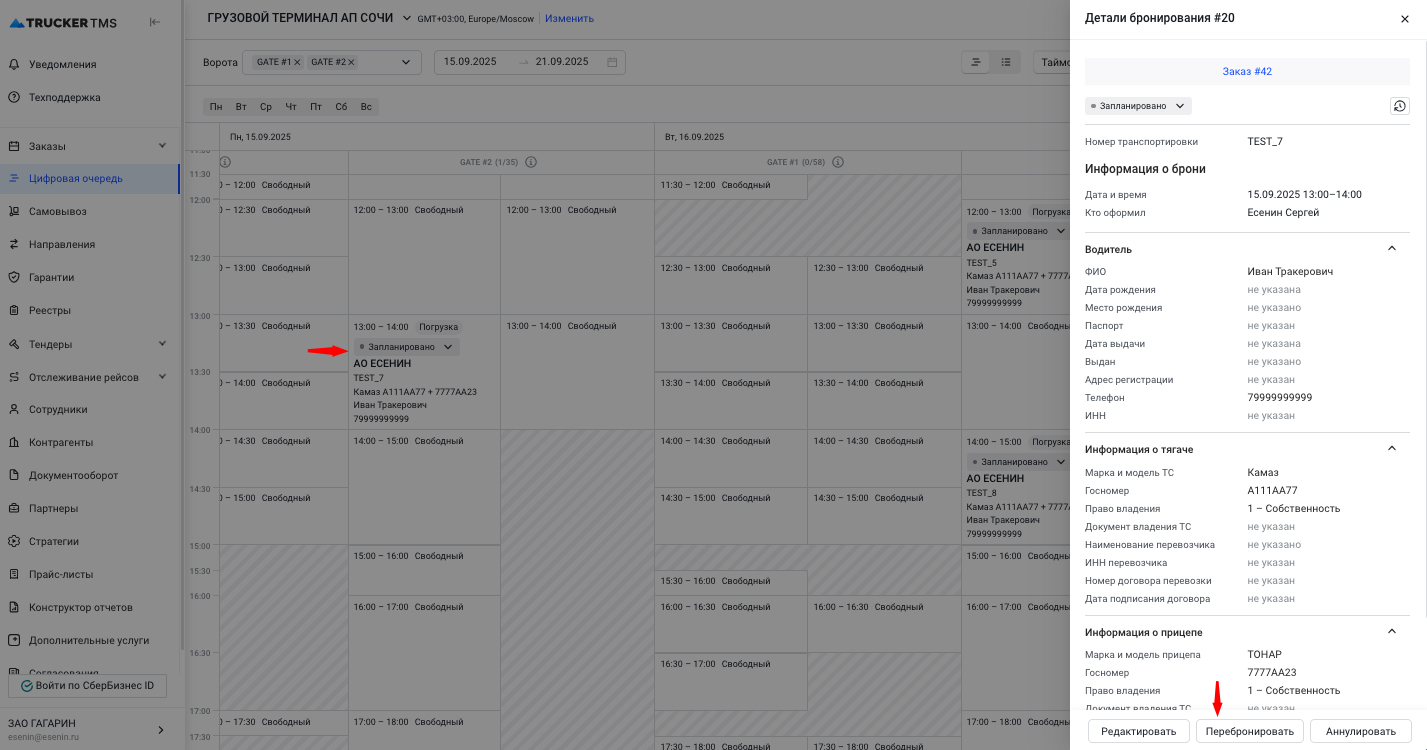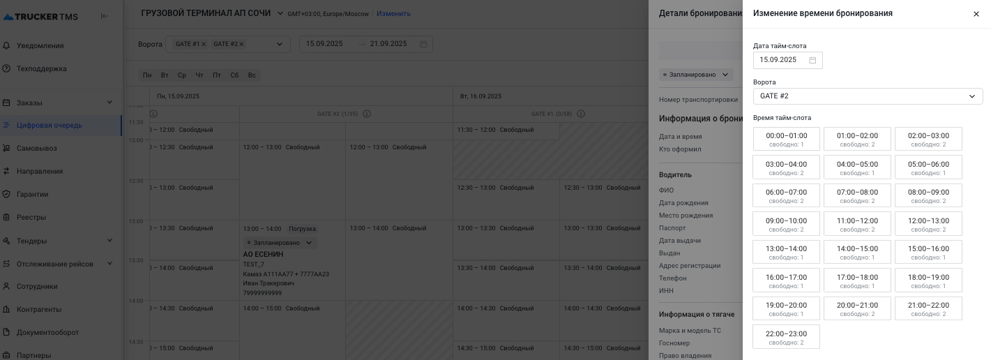Для всех типов бронирований (с транспортным заказов или без транспортного заказа) можно перебронировать таймслот на другое время
