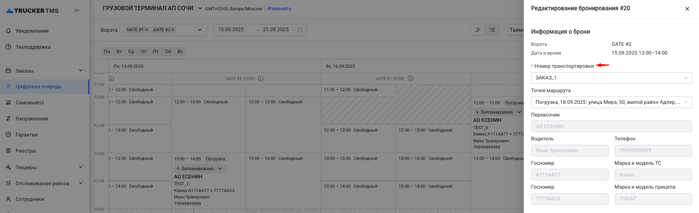 Для бронирования под транспортный заказ можно отредактировать номер транспортировки