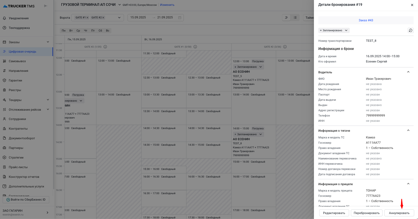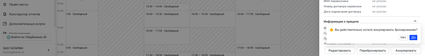 Выберите таймслот и нажмите на кнопку "Аннулировать". После аннулирования, таймслот также исчезнет и у перевозчика