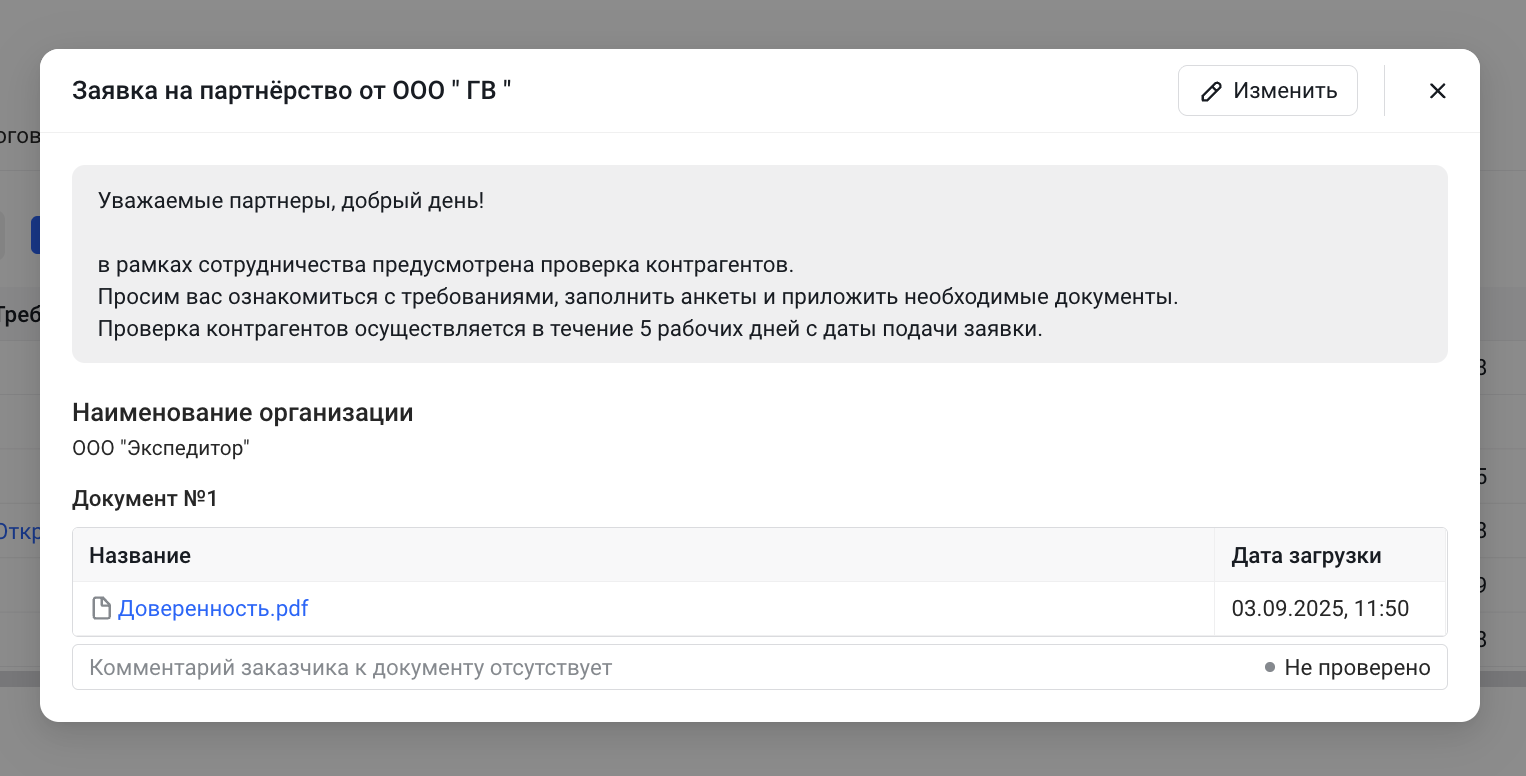 Если грузовладелец использует аккредитацию исполнителей, у перевозчика появился доступ к результатам проверки: статусы и комментарии к документам, которые оставил заказчик. Просмотр доступен в разделе «Партнёры» — колонка «Требования для партнёрства». Так замечания видны сразу, правки вносятся быстрее, а цикл согласования сокращается.