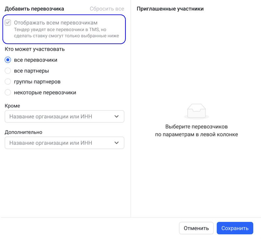 Расширена логика работы с тендерами со стороны перевозчиков. Теперь заказчик может настроить отображение тендера для более широкого круга исполнителей без допуска к участию в торгах.