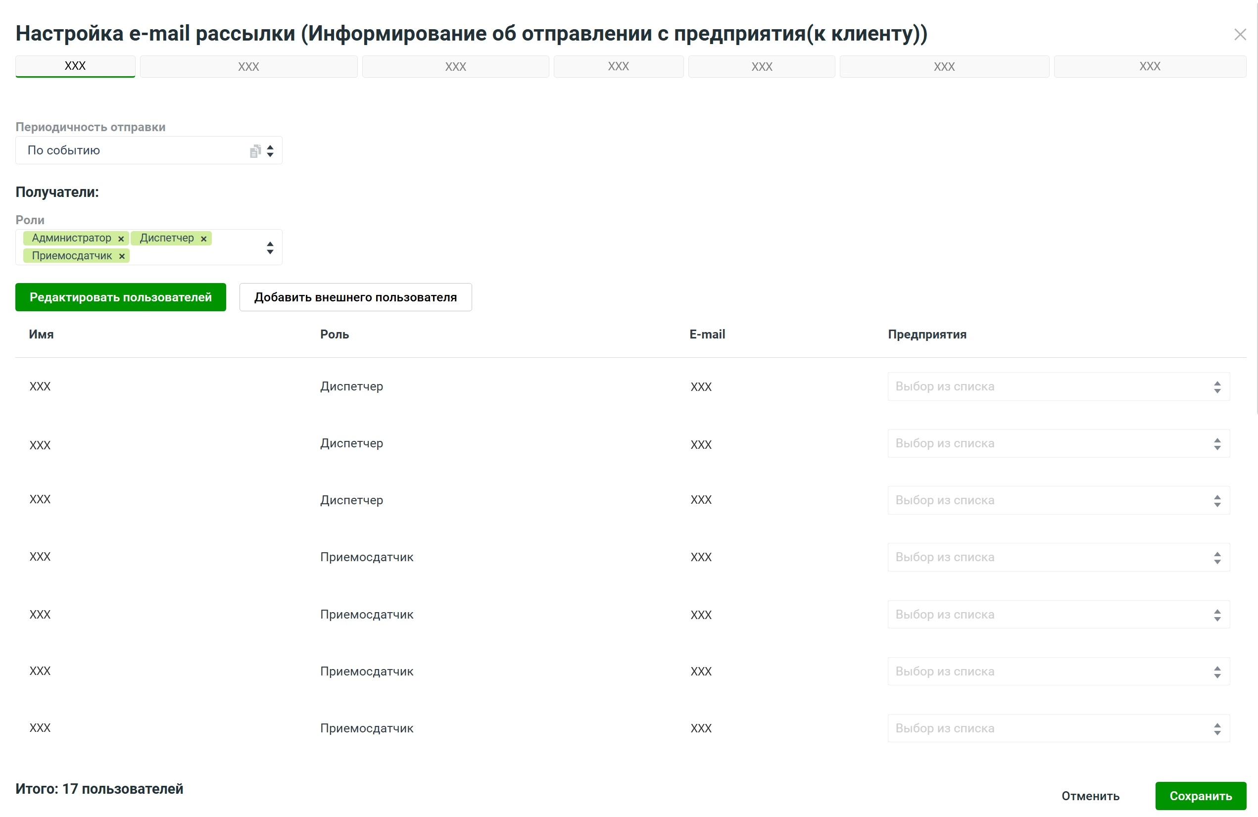 В появившемся модальном окне уберите галочки напротив тех, кто не должен получать письма.Если пользователь (например, «Администратор») имеет доступ сразу к нескольким предприятиям, то в колонке «Предприятия» для него будет доступен выпадающий список.