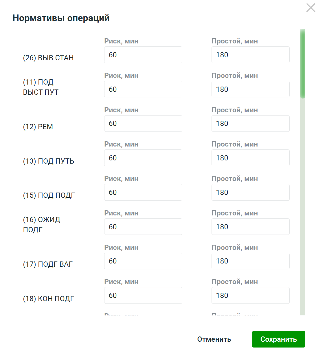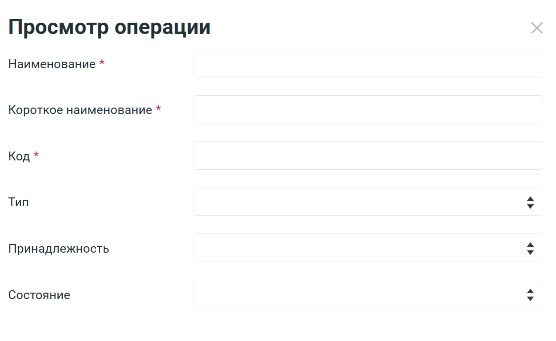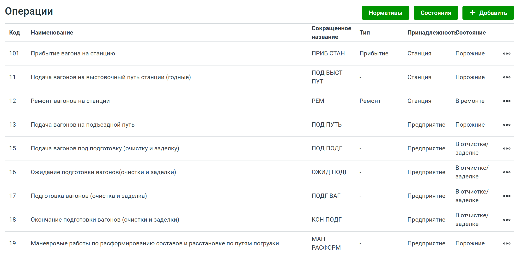 Каждая операция имеет уникальный код, полное и сокращённое наименование, тип, принадлежность (станция или предприятие) и связанное состояние.