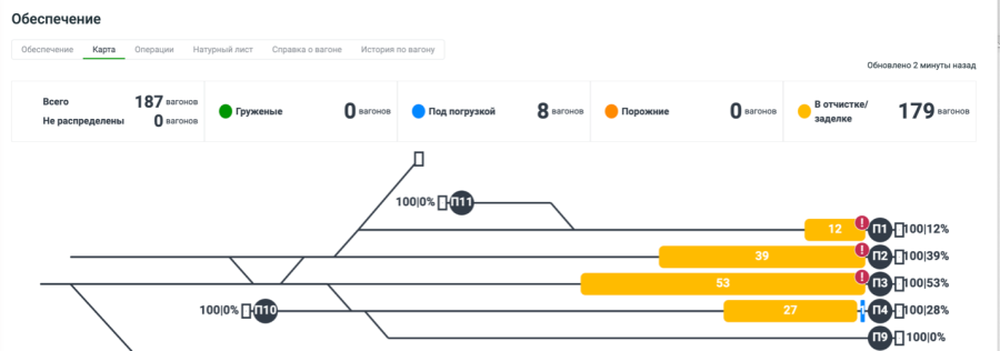 В данном разделе реализована схема путей предприятия и расположение вагонов, с отметкой по текущему статусу по цветовой градации. Легенда с описанием цветовой принадлежности отобразиться сверху интерфейса.