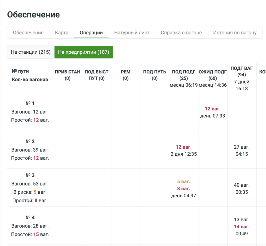 В разделе «Операции» расположен срез данных в реальном времени, по каждому пути, какое количество вагонов находится под операцией. Красным цветом отображаются вагоны, находящиеся в простои по операции. Простой по операции настраивается в настройках администратором системы. Пример реализации на рисунке справа.