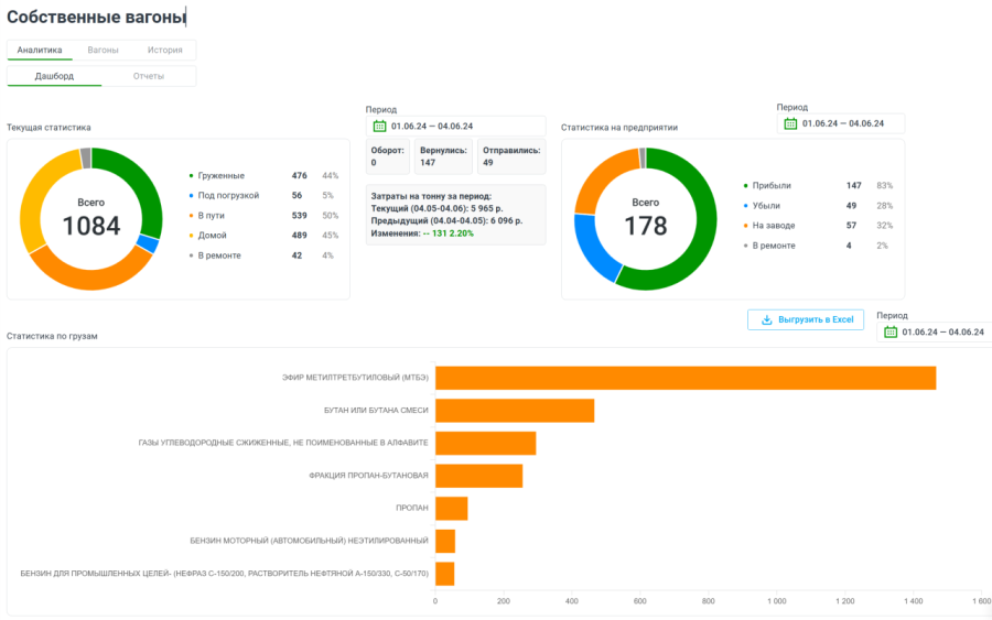 Раздел предназначен для юр. лиц, имеющих собственные вагоны. В данном разделе отражается аналитическая информация по вагонам в виде диаграмм и виджетов, пример отражен на рисунке ниже.