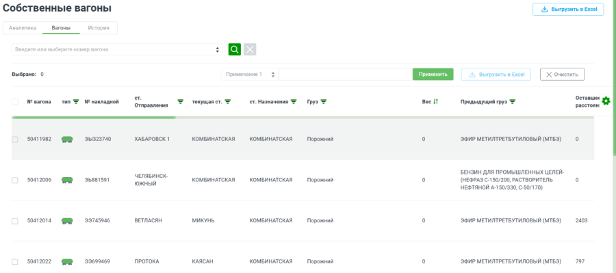Также доступен полный реестр собственных вагонов с подробной информацией по каждому вагону и история по аналогии с разделом обеспечение, пример отражен на рисунке ниже.