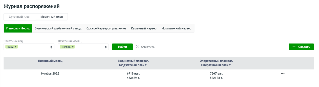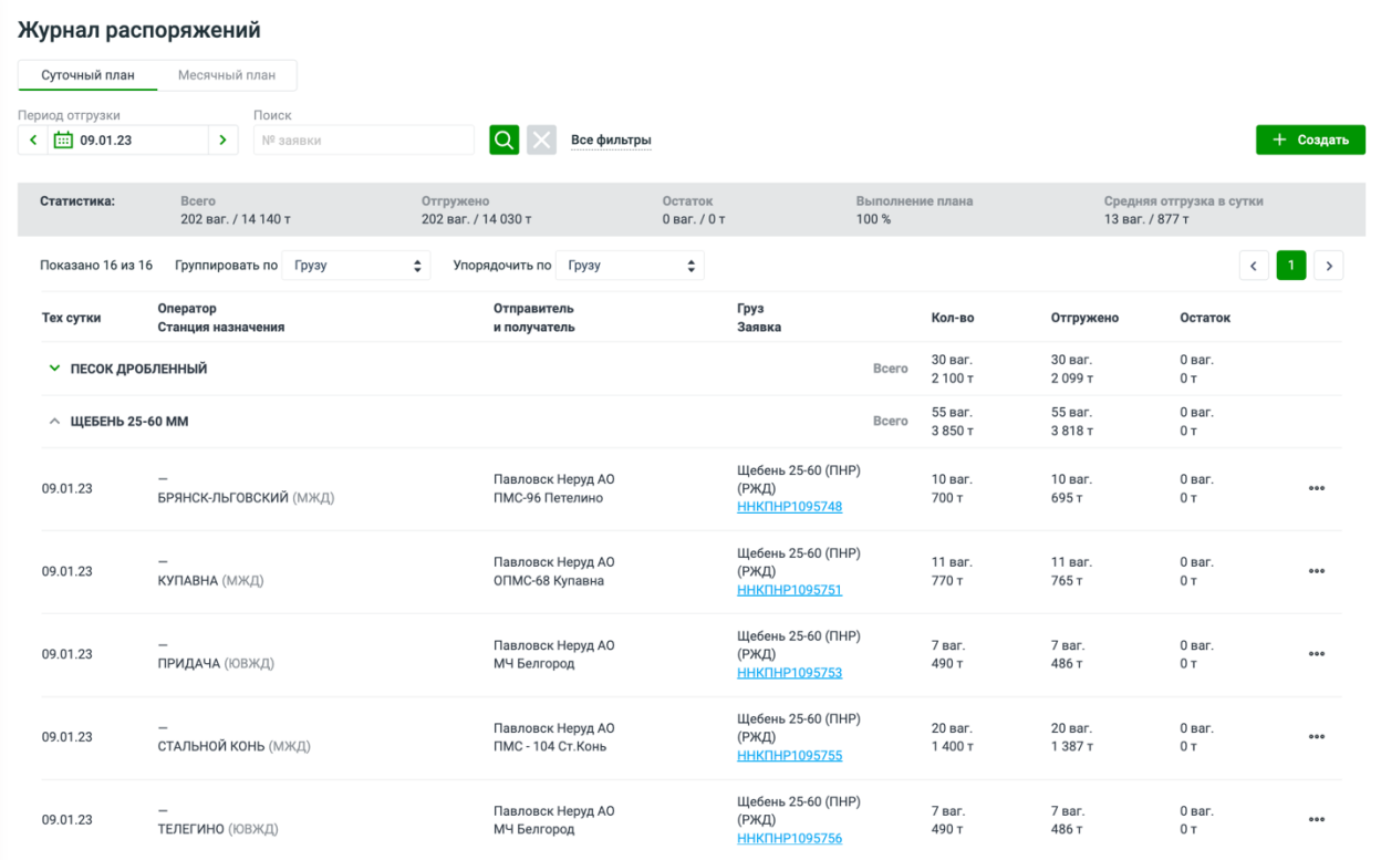 Созданные распоряжения, можно просмотреть в разделе «Журнал распоряжений», где отображаются запланированные отгрузки продукции на тех. сутки предприятия. В этом же разделе имеется возможность создавать, редактировать, удалять распоряжения, а также просматривать список распоряжений и статистику по отгрузкам.