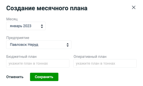 Создание месячного плана возможно по атрибутам: месяц; предприятие; бюджетный план; оперативный план. Пример интерфейса изображен на рисунке ниже.