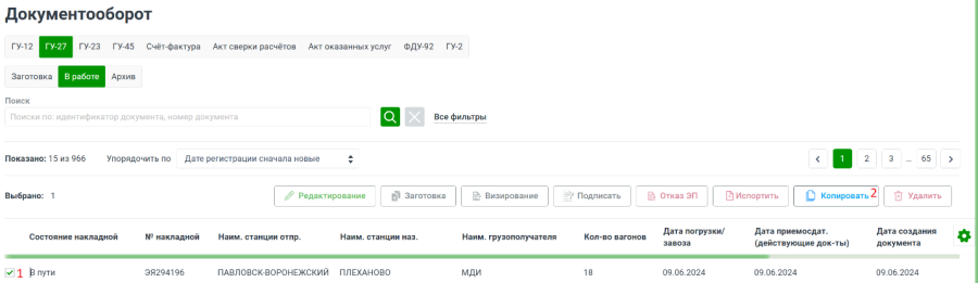 Пользователям системы может потребоваться создать документ аналогичный уже готовому. Для таких случаев предусмотрена возможность создание копии документа. Для этого необходимо в реестре документов выбрать галочкой документ из любой вкладки (заготовка, в работе, архив), и в меню над реестром нажать кнопку «Копировать». Копия документов со всеми заполненными полями будет отражена в реестре документов в заготовках.