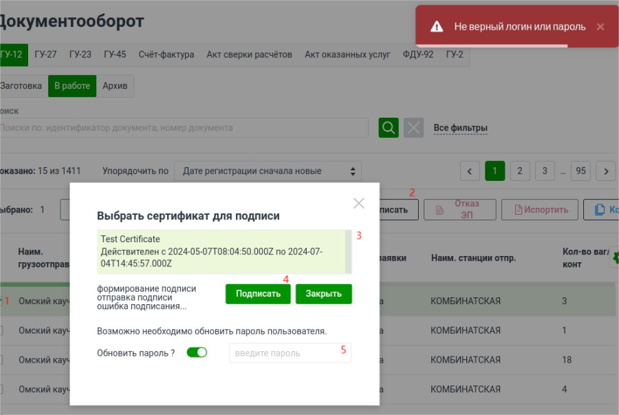 - Нажать кнопку в окне выбора сертификата «Подписать»;