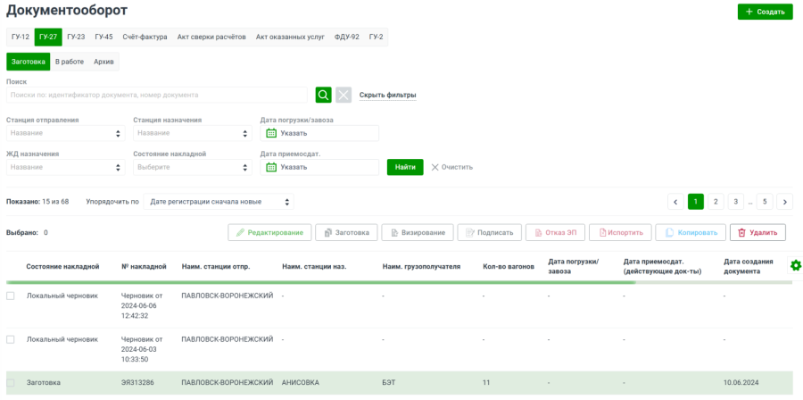 На платформе предусмотрены системы поиска, фильтров и сортировок документов. При переходе в раздел документа «Документооборот» > «ГУ-27», во второй строке меню на выбор есть три фильтра: заготовка, в работе, архив. Здесь можно переключаться между реестрами документов: документы в процессе создания, находящие в обработке (в процессе утверждения: согласование, подписание), завершенные документы (подписанные, отмененные).
