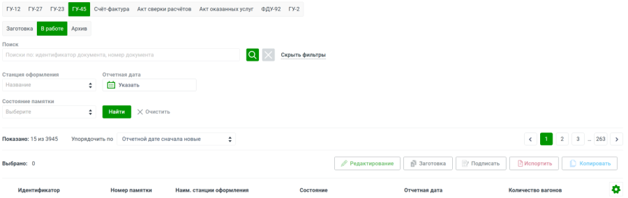 На платформе предусмотрены системы поиска, фильтров и сортировок документов. При переходе в раздел документа «Документооборот» > «ГУ-45», во второй строке меню на выбор есть три фильтра: заготовка, в работе, архив. Здесь можно переключаться между реестрами документов: документы в процессе создания, находящие в обработке (в процессе утверждения: согласование, подписание), завершенные документы (подписанные, отмененные).