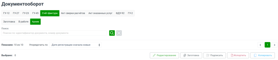 На платформе предусмотрены системы поиска и сортировок документов. При переходе в раздел документа «Документооборот» > «Счёт-фактура», во второй строке меню на выбор есть два фильтра: в работе, архив. Здесь можно переключаться между реестрами документов: находящие в обработке (согласование, подписание), завершенные документы (подписанные).