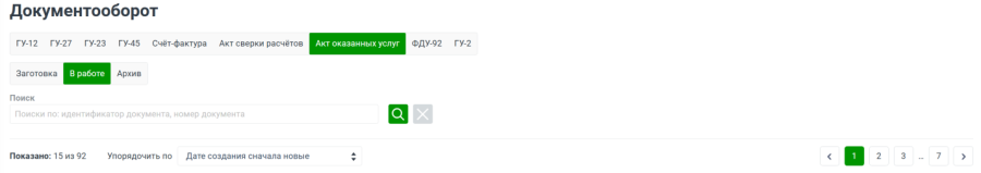 На платформе предусмотрены системы поиска и сортировок документов. При переходе в раздел документа «Документооборот» > «Акт оказанных услуг», во второй строке меню на выбор есть два фильтра: в работе, архив. Здесь можно переключаться между реестрами документов: находящие в обработке (согласование, подписание), завершенные документы (подписанные).