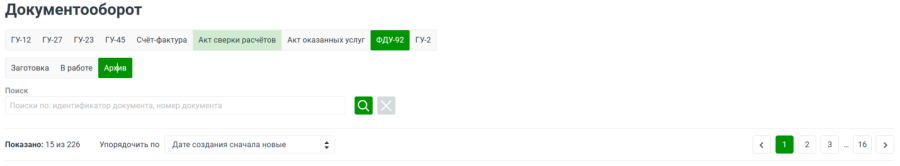 На платформе предусмотрены системы поиска, фильтров и сортировок документов. При переходе в раздел документа «Документооборот» > «ФДУ-92», во второй строке меню на выбор есть три фильтра: заготовка, в работе, архив. Здесь можно переключаться между реестрами документов: документы в процессе создания, находящие в обработке (в процессе утверждения: согласование, подписание), завершенные документы (подписанные, отмененные).