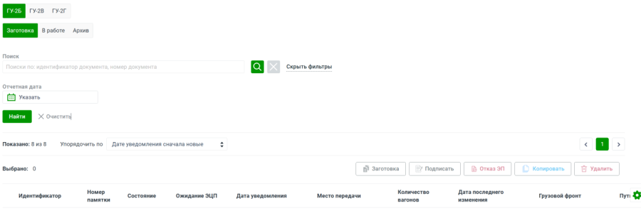 На платформе предусмотрены системы поиска, фильтров и сортировок документов. При переходе в раздел документа «Документооборот» > «ГУ-2» > «ГУ-2Б», во второй строке меню на выбор есть три фильтра: заготовка, в работе, архив. Здесь можно переключаться между реестрами документов: документы в процессе создания, находящие в обработке (в процессе утверждения: согласование, подписание), завершенные документы (подписанные, отмененные).