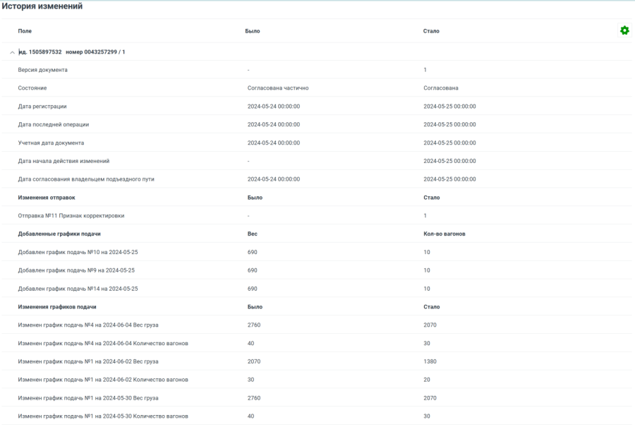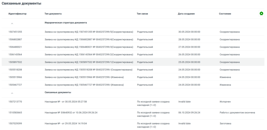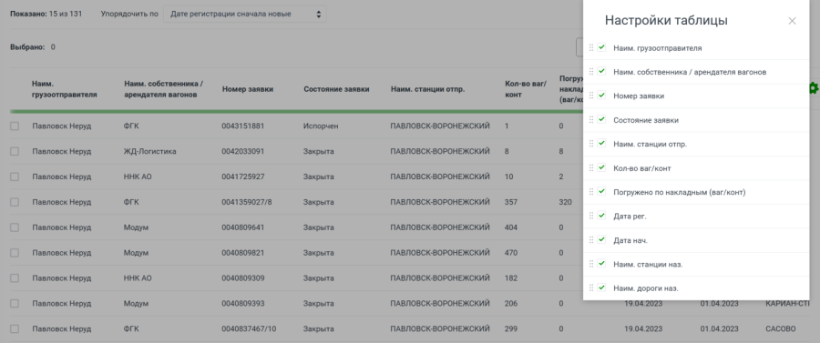 В таблице приведен реестр заявок на перевозку грузов железнодорожным транспортом по форме ГУ-12. Отображение таблицы можно настроить индивидуально для каждого пользователя нажатием на значок шестеренки, включением/отключением и перетаскиванием полей таблицы.