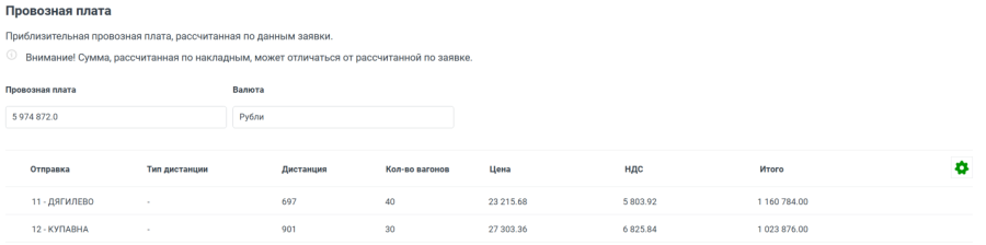 - Расчет ориентировочной суммы провозной платы по данным заявки во вкладке провозная плата.