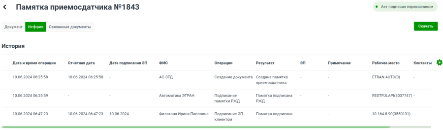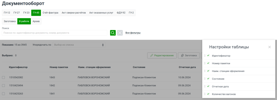В таблице приведен реестр памяток приемосдатчика по форме ГУ-45. Отображение таблицы можно настроить индивидуально для каждого пользователя нажатием на значок шестеренки, включением/отключением и перетаскиванием полей таблицы. При двойном нажатии на строку с интересующим документом откроется страница с разделами и полями документа, аналогичными оригиналу.