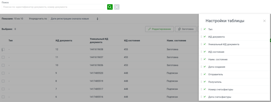 В таблице приведен реестр документов. Отображение таблицы можно настроить индивидуально для каждого пользователя нажатием на значок шестеренки, включением/отключением и перетаскиванием полей таблицы.