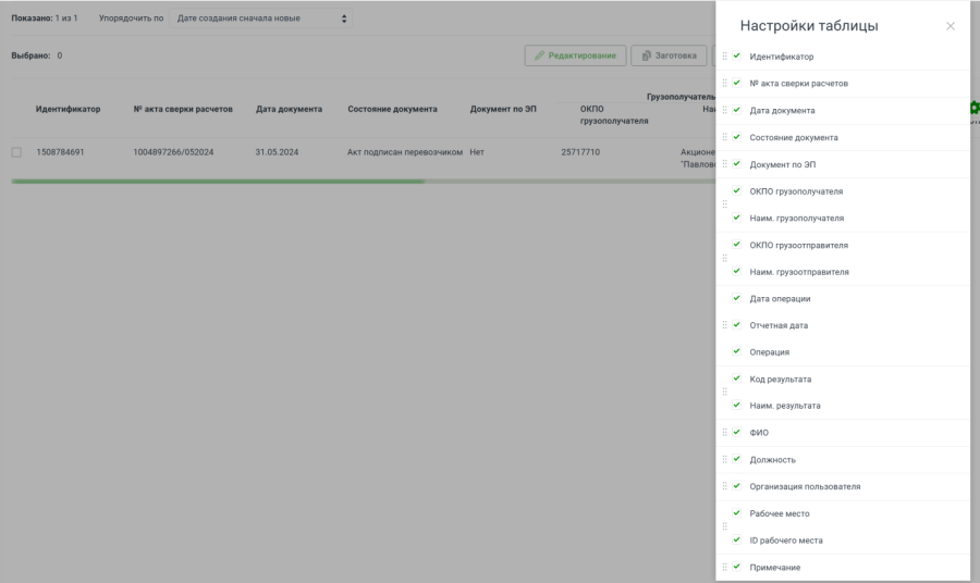 В таблице приведен реестр документов. Отображение таблицы можно настроить индивидуально для каждого пользователя нажатием на значок шестеренки, включением/отключением и перетаскиванием полей таблицы.