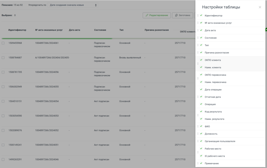 В таблице приведен реестр документов. Отображение таблицы можно настроить индивидуально для каждого пользователя нажатием на значок шестеренки, включением/отключением и перетаскиванием полей таблицы.