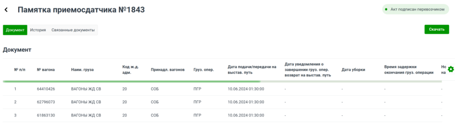 Не все документы доступны для скачивания из системы. Если документ отсутствует в Rail Cargo, то вместо скачивания при нажатии на кнопку будет осуществлено перемещение в ЭТРАН на страничку документа с возможностью скачать.